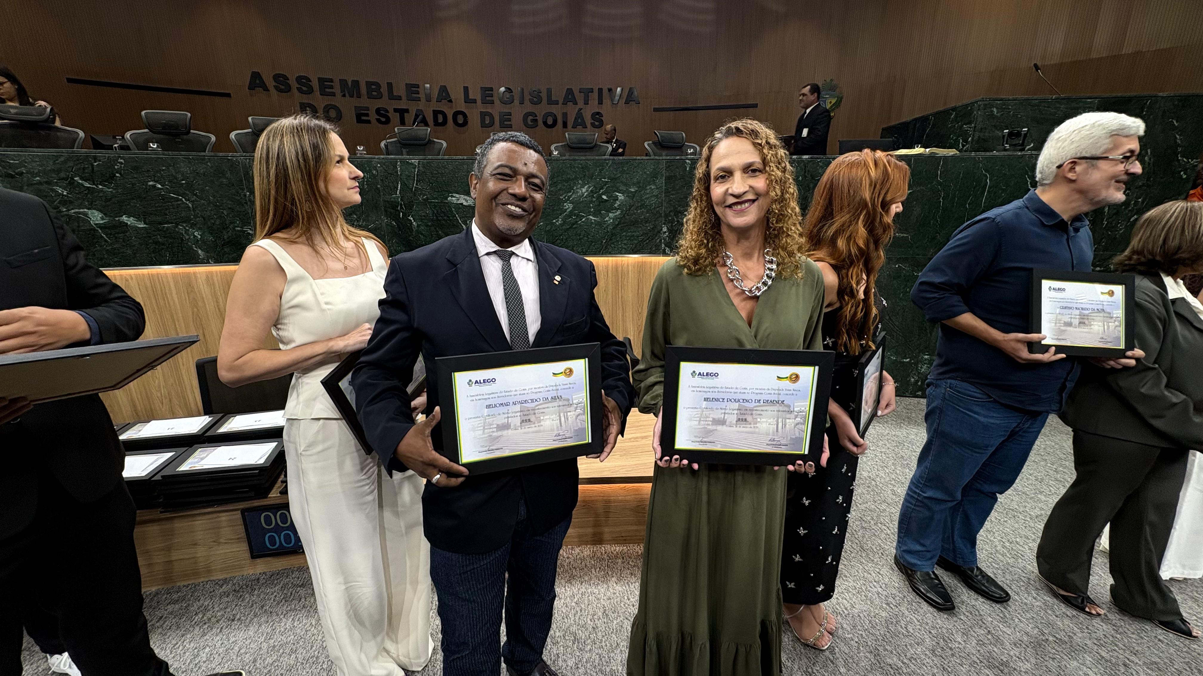 Funcionários da EFG Luiz Rassi, de Aparecida de Goiânia, Heliomar Aparecido da Silva e Helenice Policeno, recebem a certificação de Mérito Legislativo (Foto: Wéber Félix)